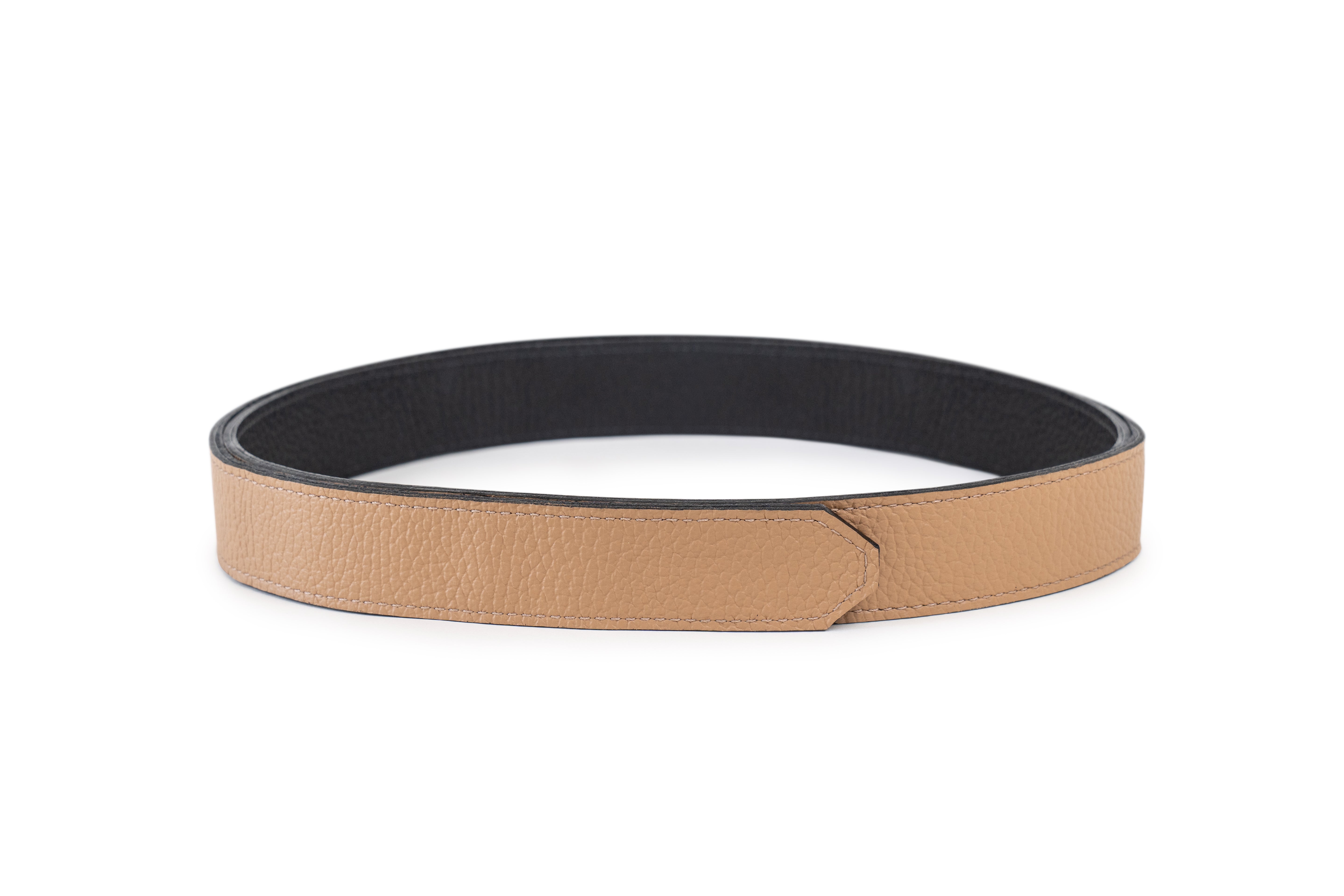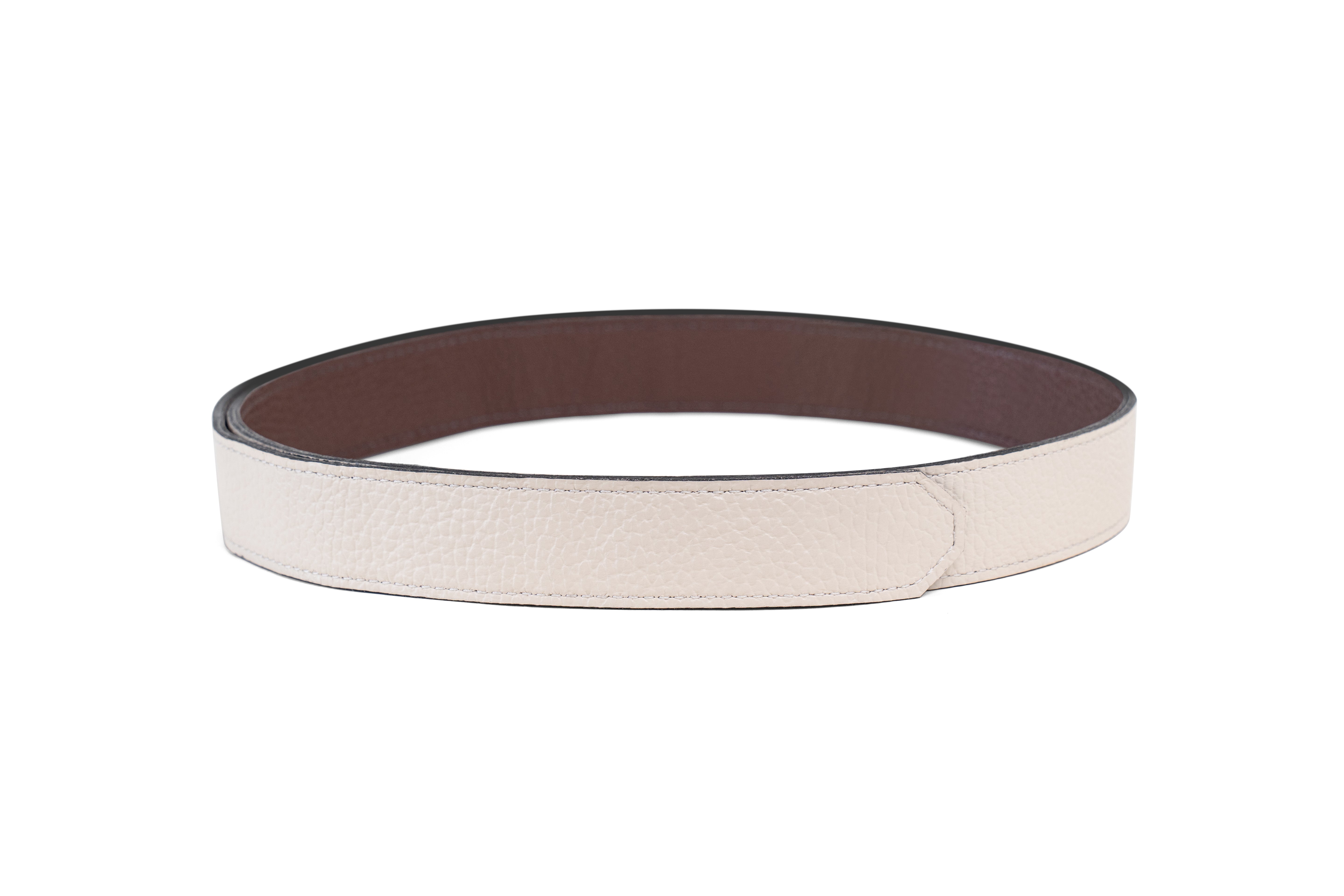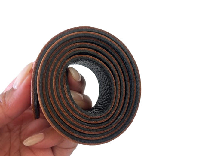 We are committed to using 100% sustainable post consumer leather. Because of the natural material and softness of the leather the belt straps are pliable and will crease or look bent. Removing them from the buckle and storing the strap in a tight coil will return them to their original shape over time.