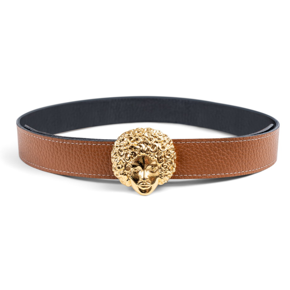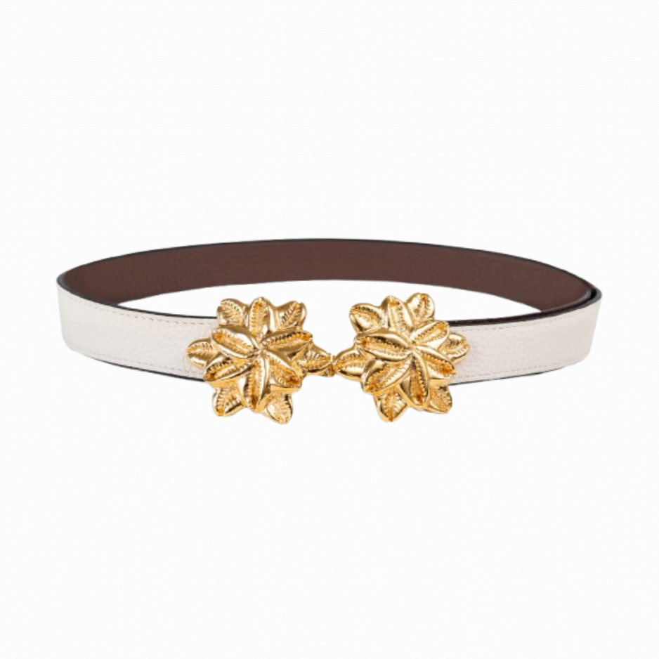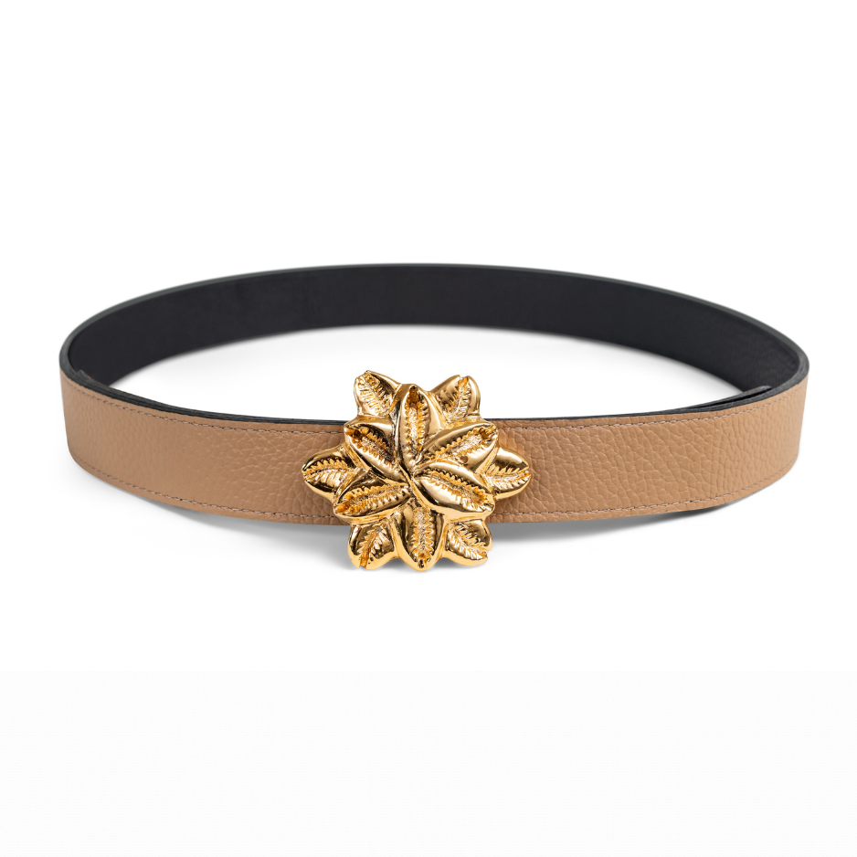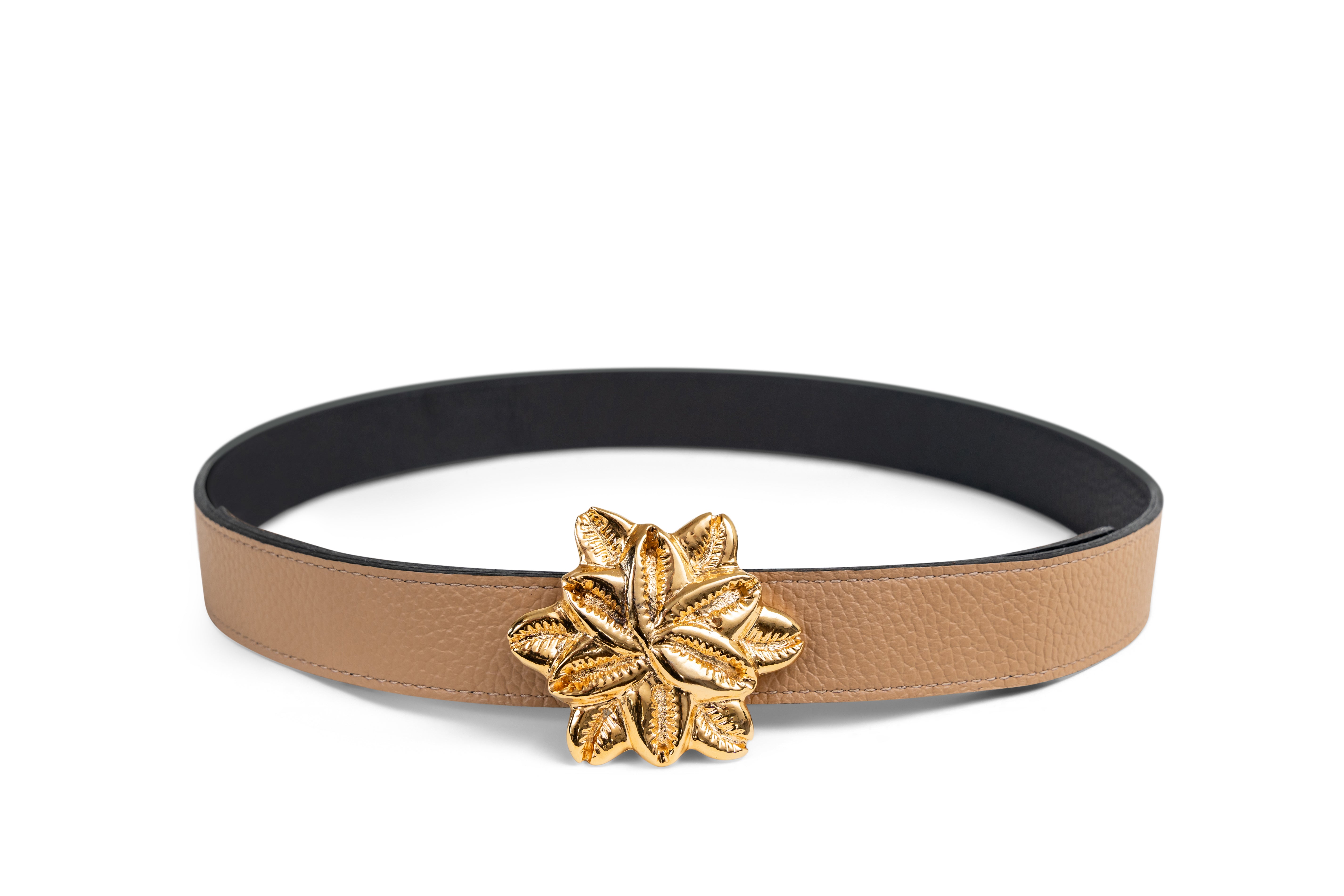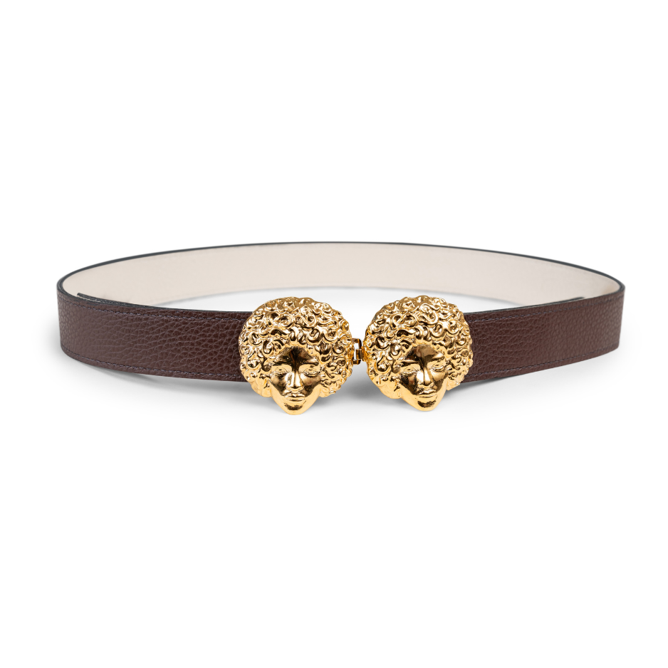 Buckles are hand crafted of pewter dipped in 18K gold and belt straps are made of 100% recycled Italian leather.