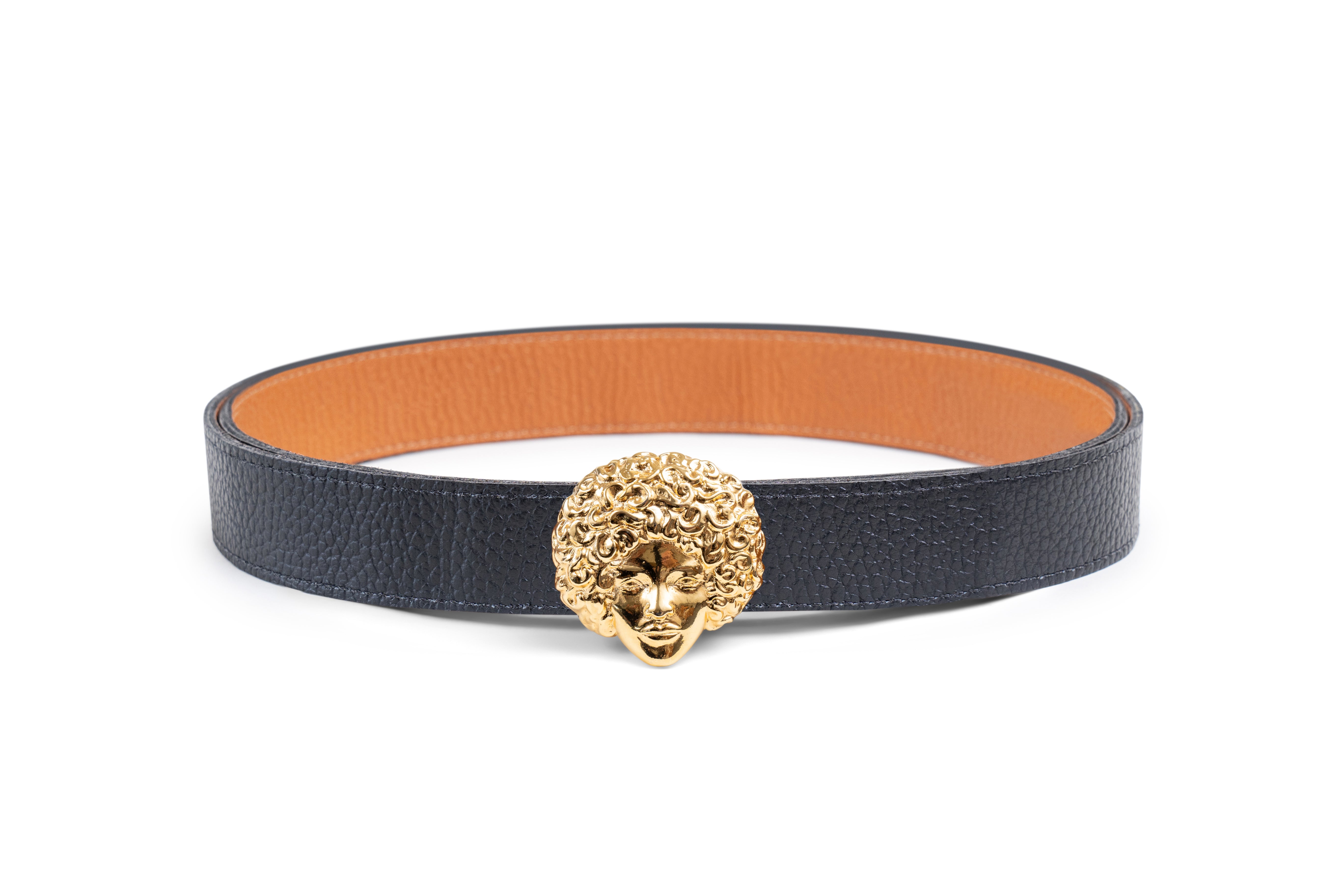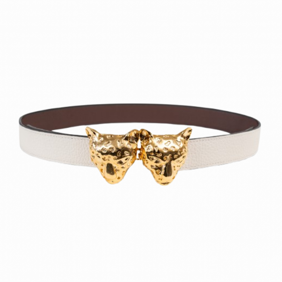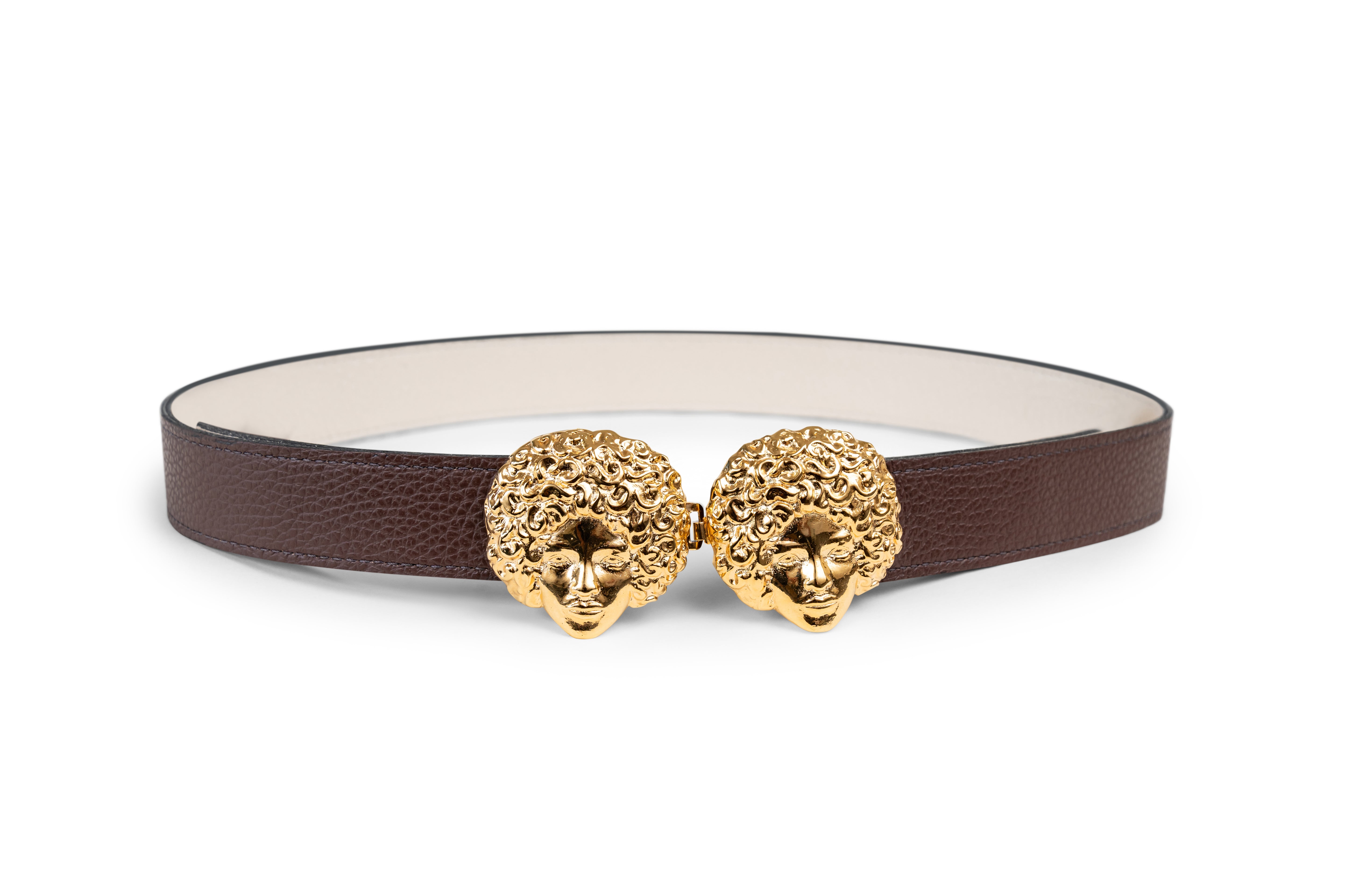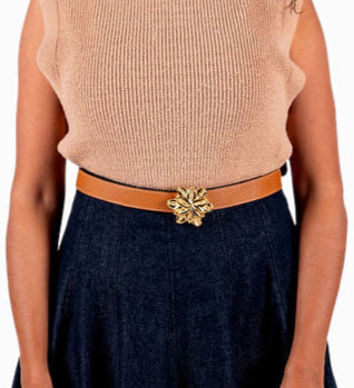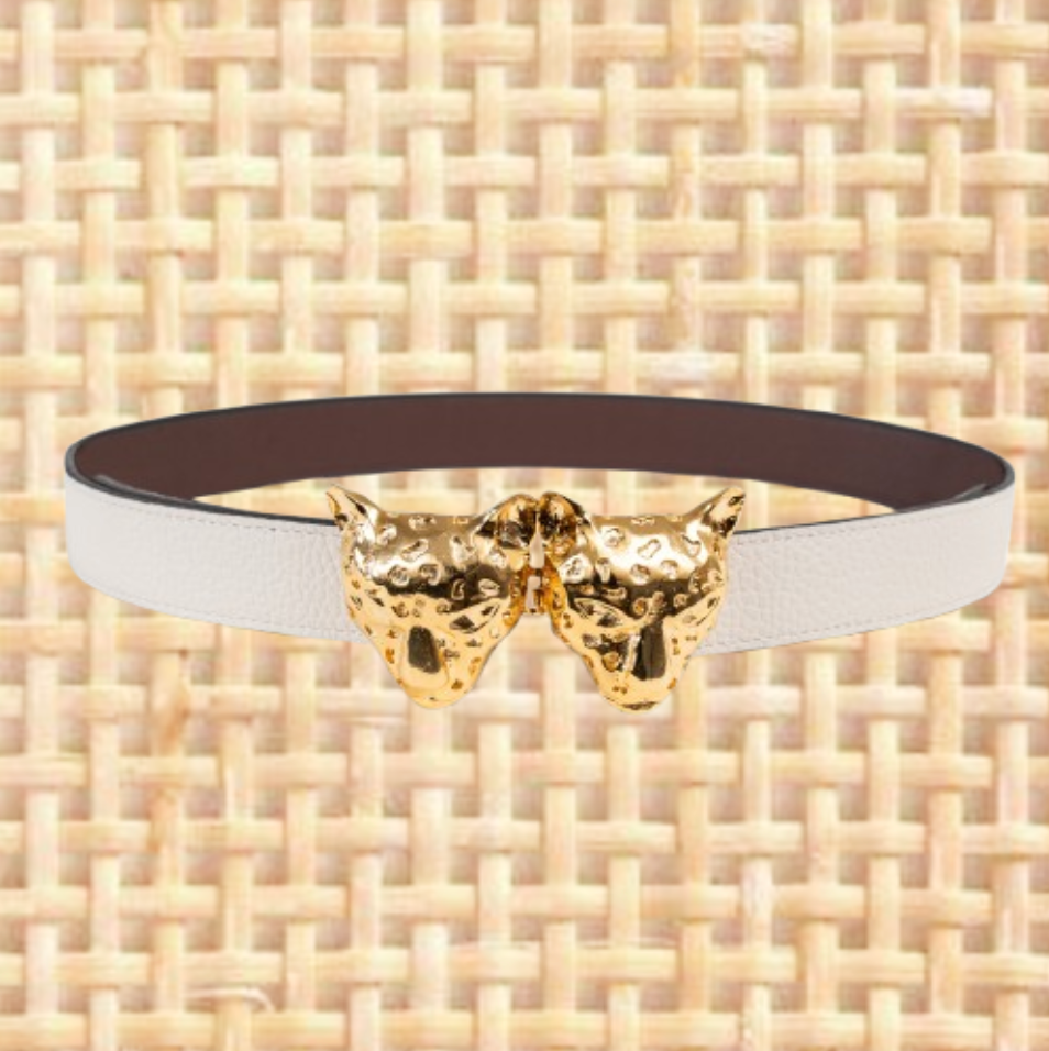 Buckles are hand crafted of pewter dipped in 18K gold and belt straps are made of 100% recycled Italian leather.