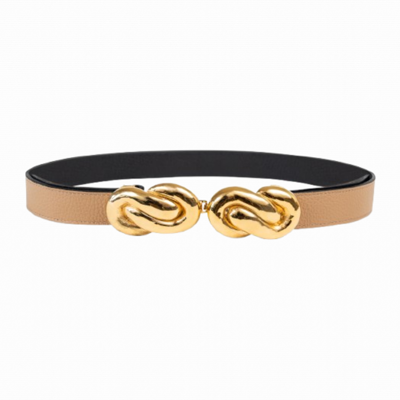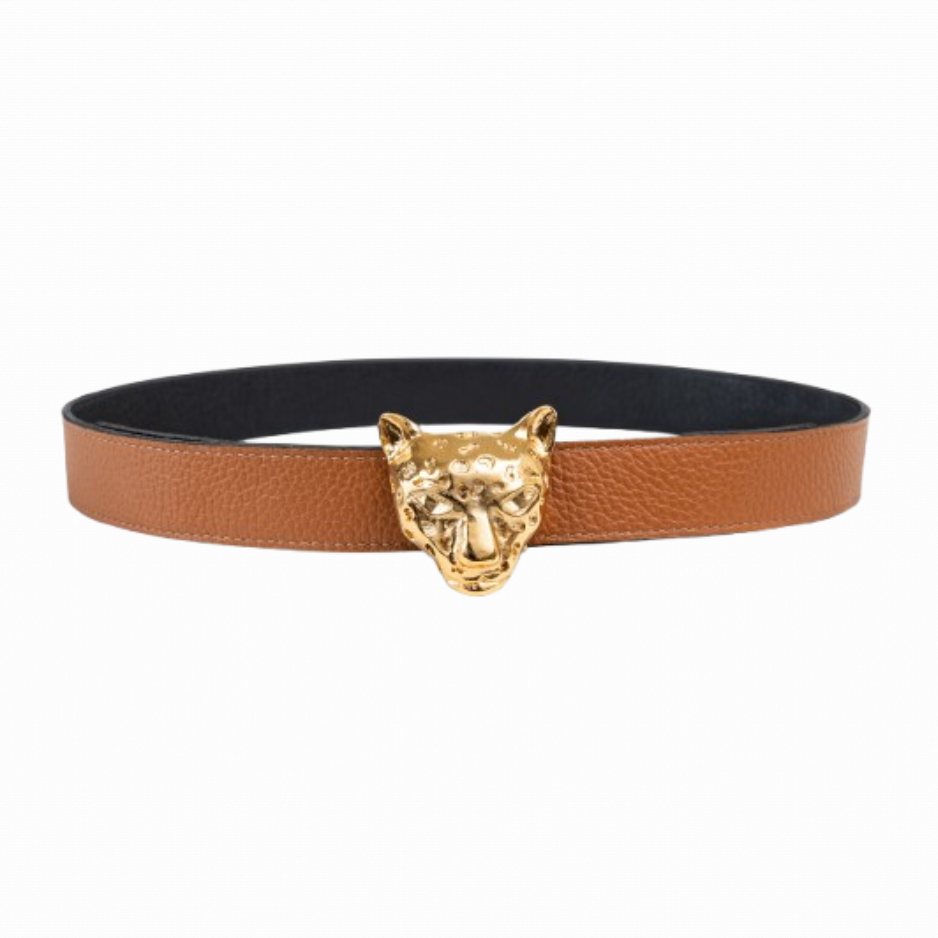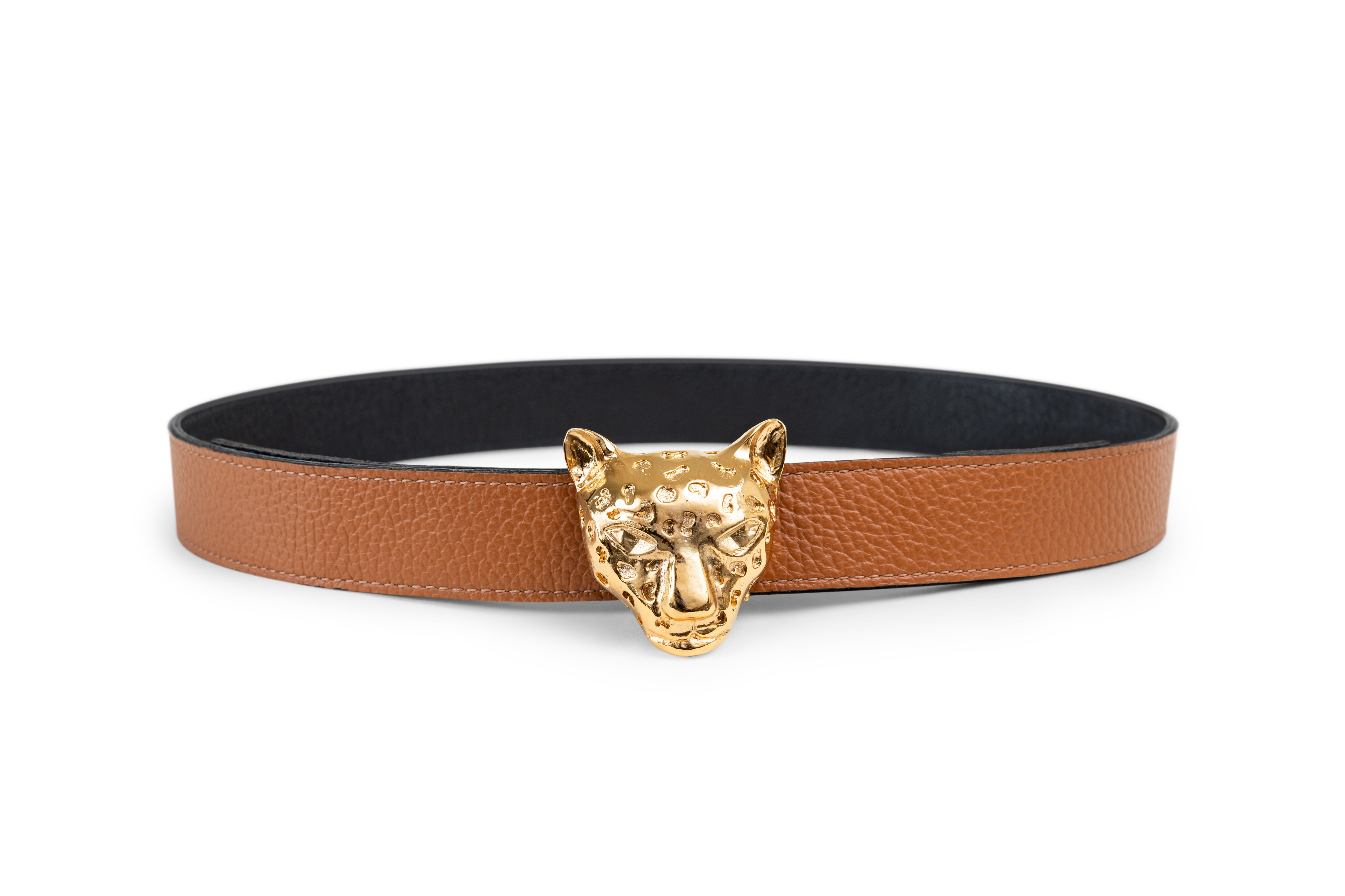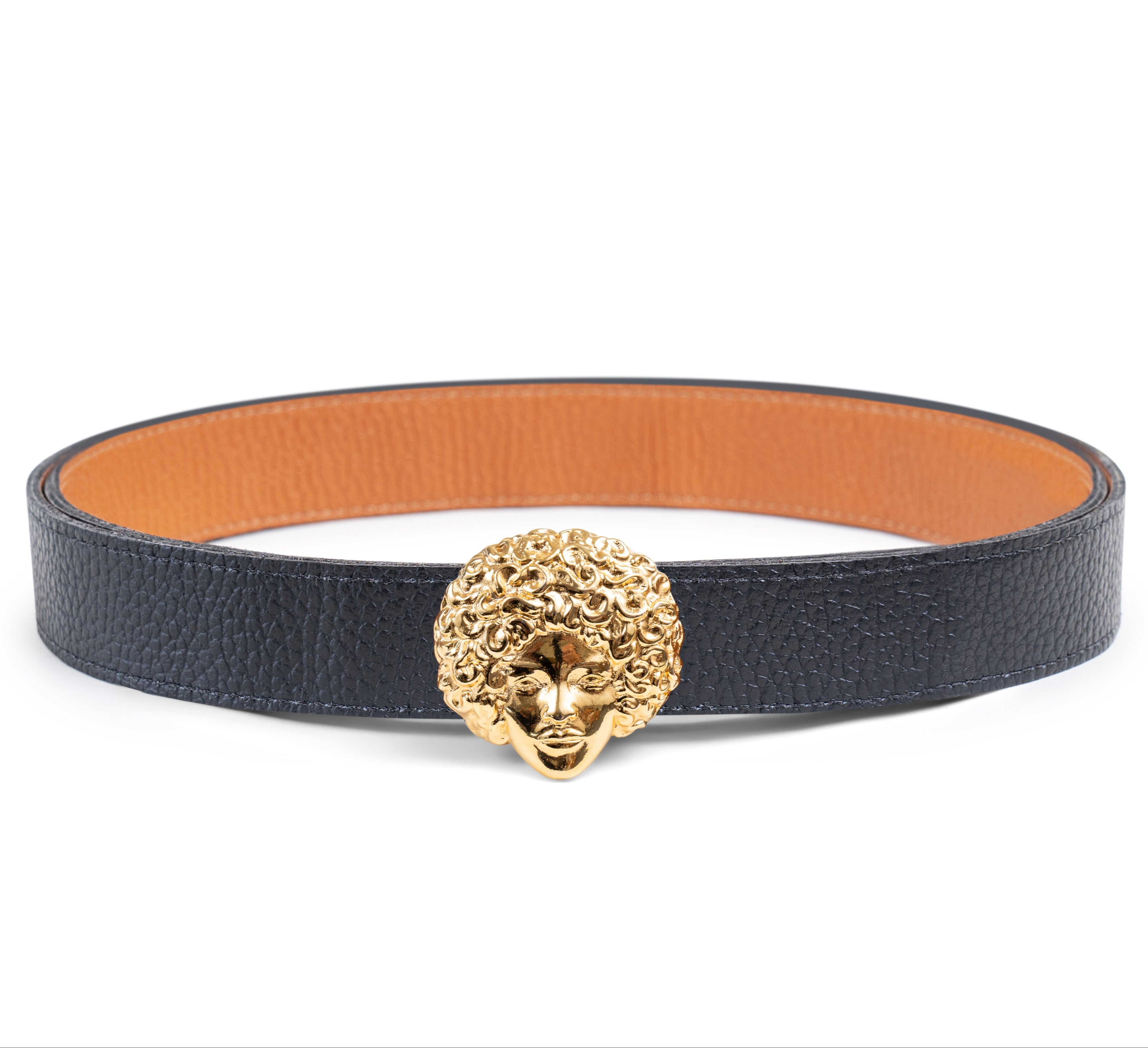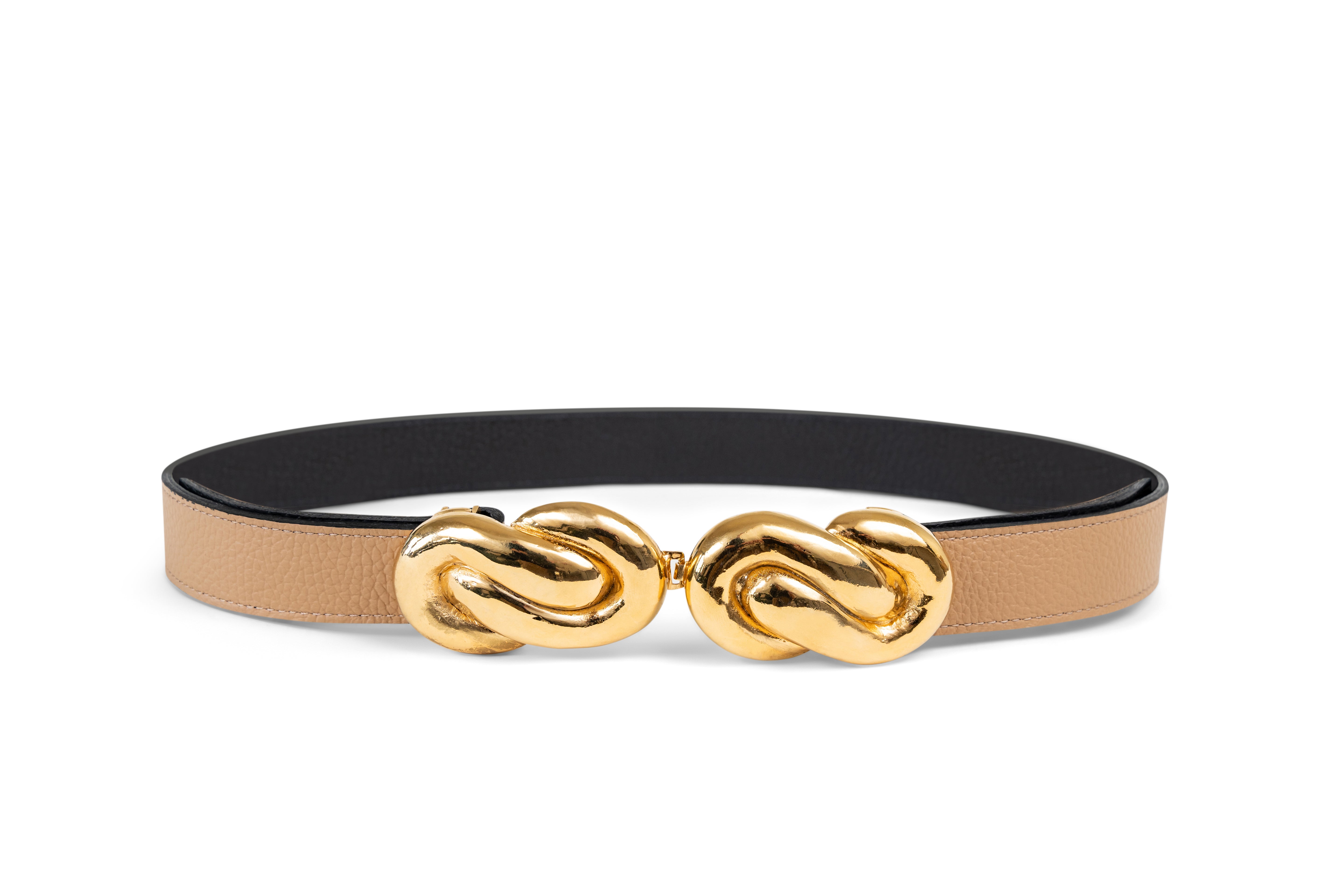 Buckles are hand crafted of pewter dipped in 18K gold and belt straps are made of 100% recycled Italian leather.
